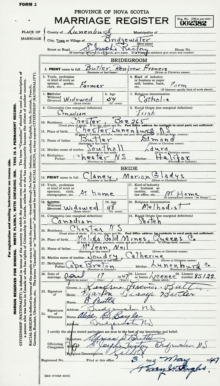 27. Birthplace Father Cape Breton Mother Lunenburg County