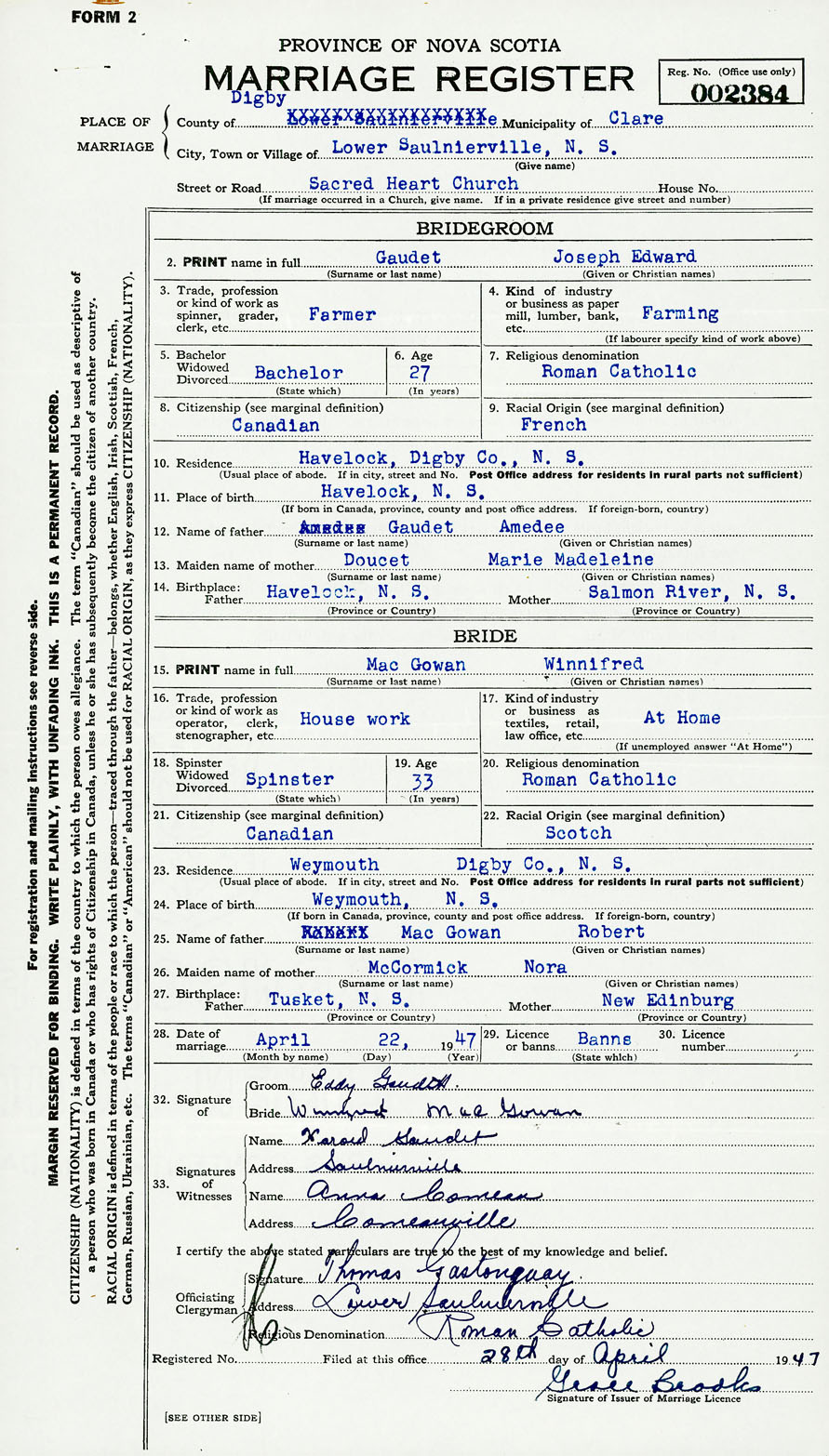 Groom Joseph Edward Gaudet