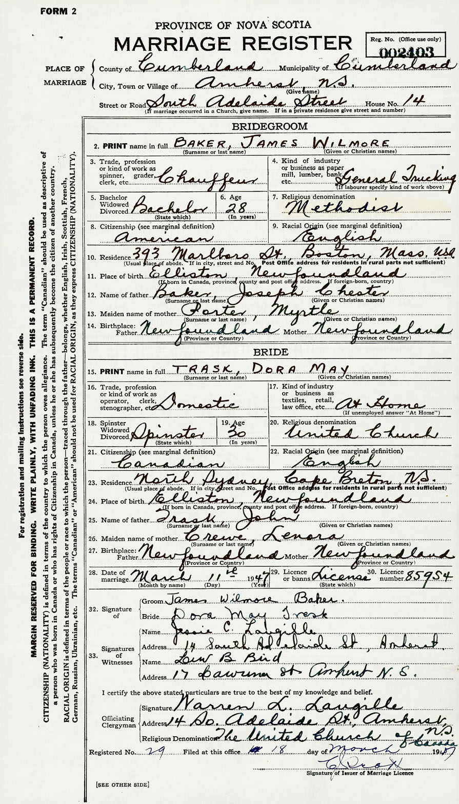 28. Date of marriage March 11 1947 29. By license or banns License 30. License number 85954