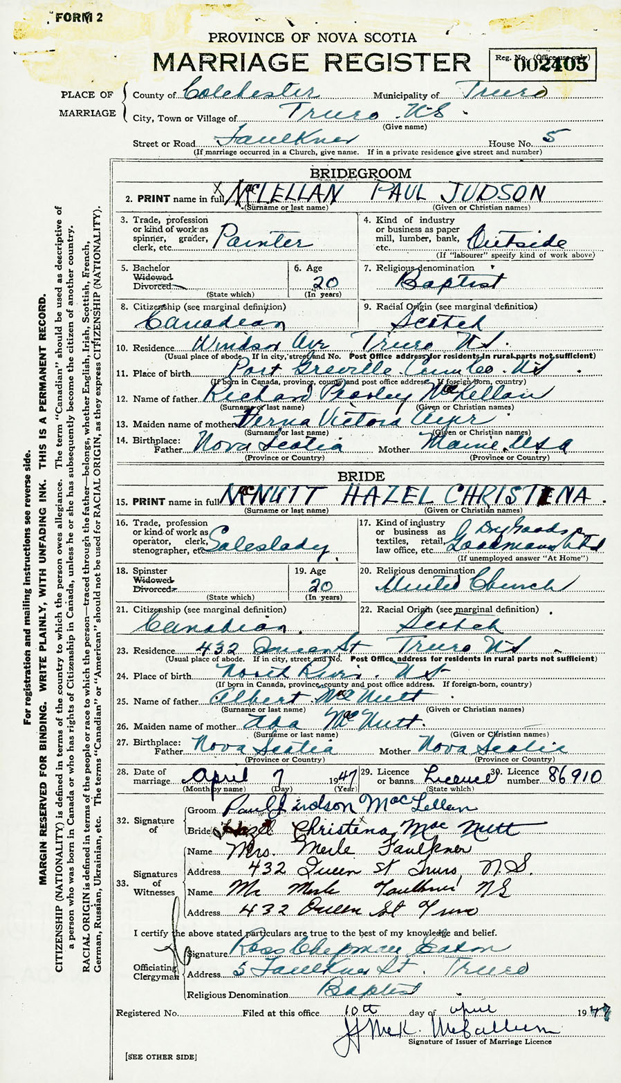 28. Date of marriage April 7 1947 29. By license or banns License 30. License number 86910