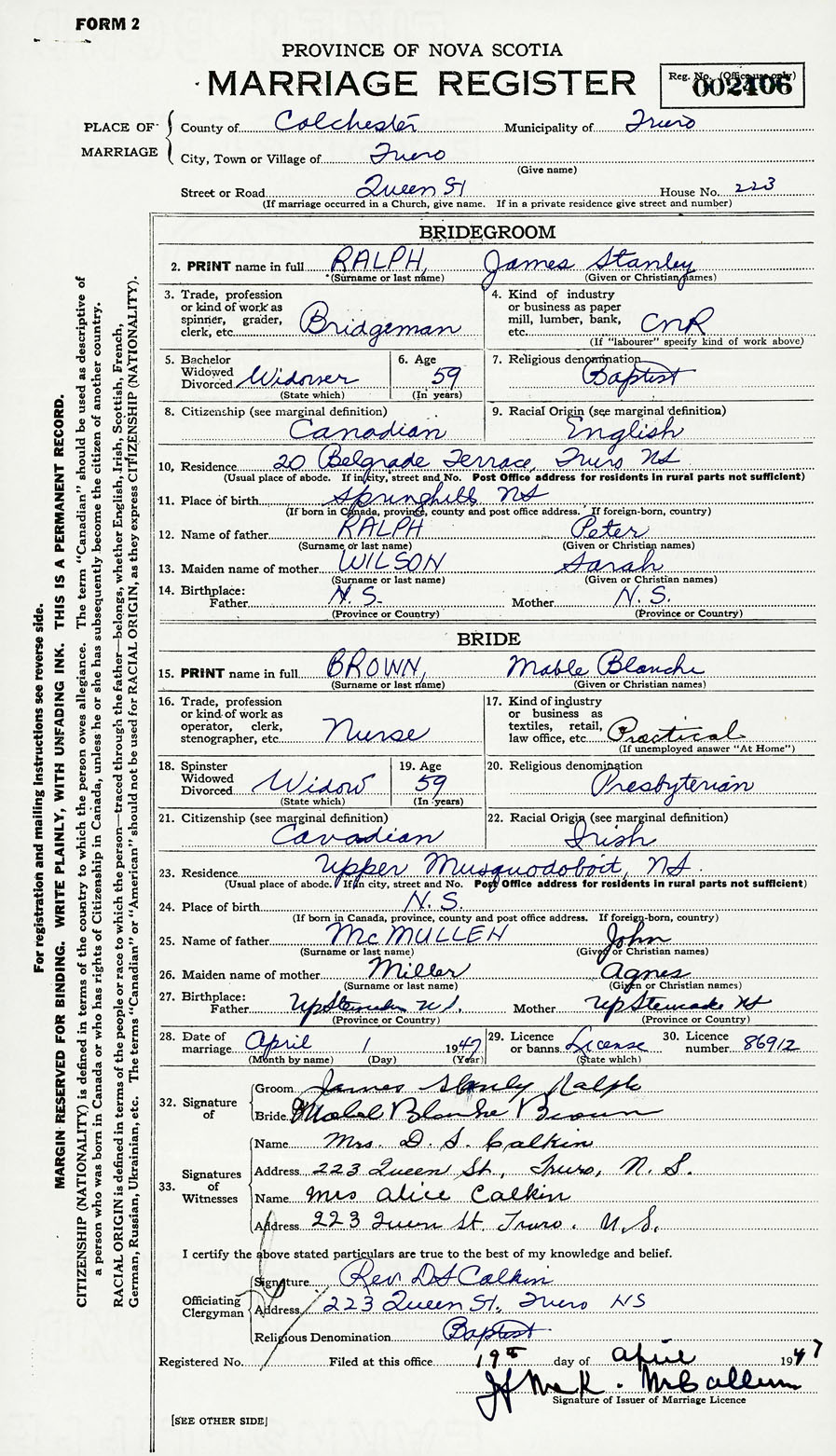 28. Date of marriage April 1 1947 29. By license or banns License 30. License number 86912