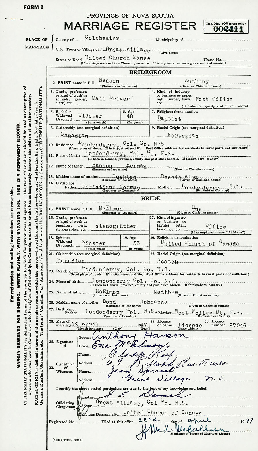 28. Date of marriage April 19 1947 29. By license or banns License 30. License number 87046