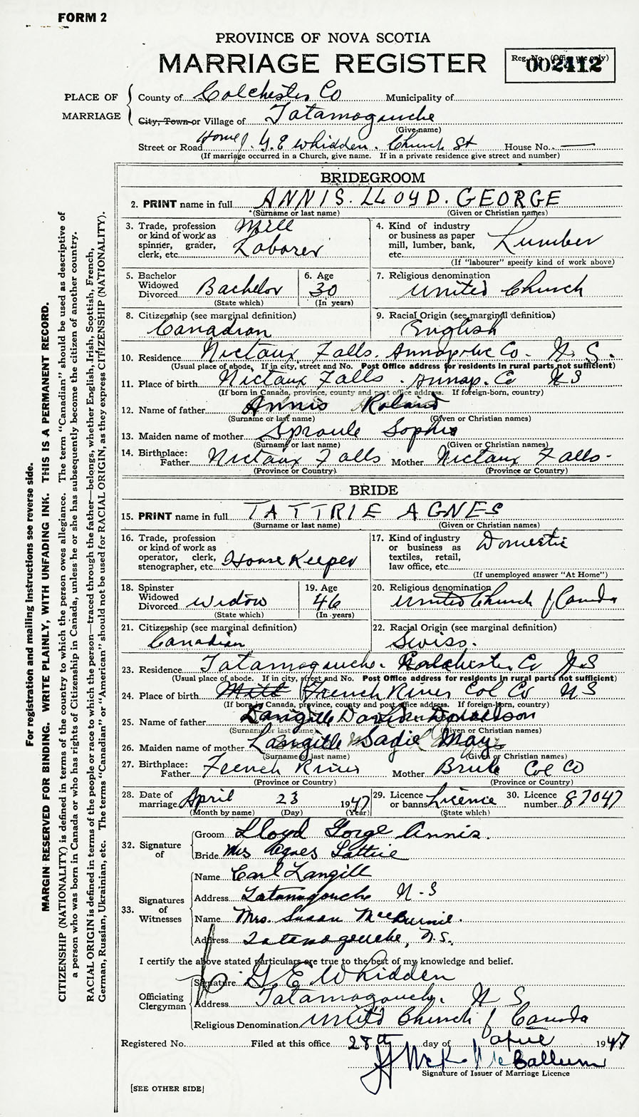 28. Date of marriage April 23 1947 29. By license or banns License 30. License number 87047