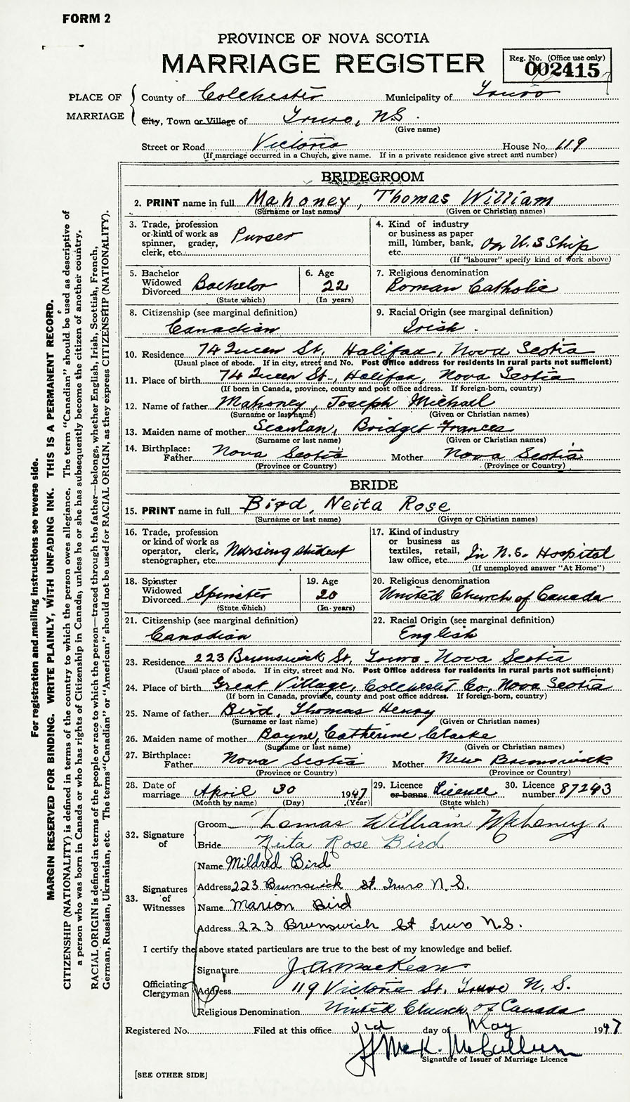 28. Date of marriage April 30 1947 29. By license or banns License 30. License number 87293