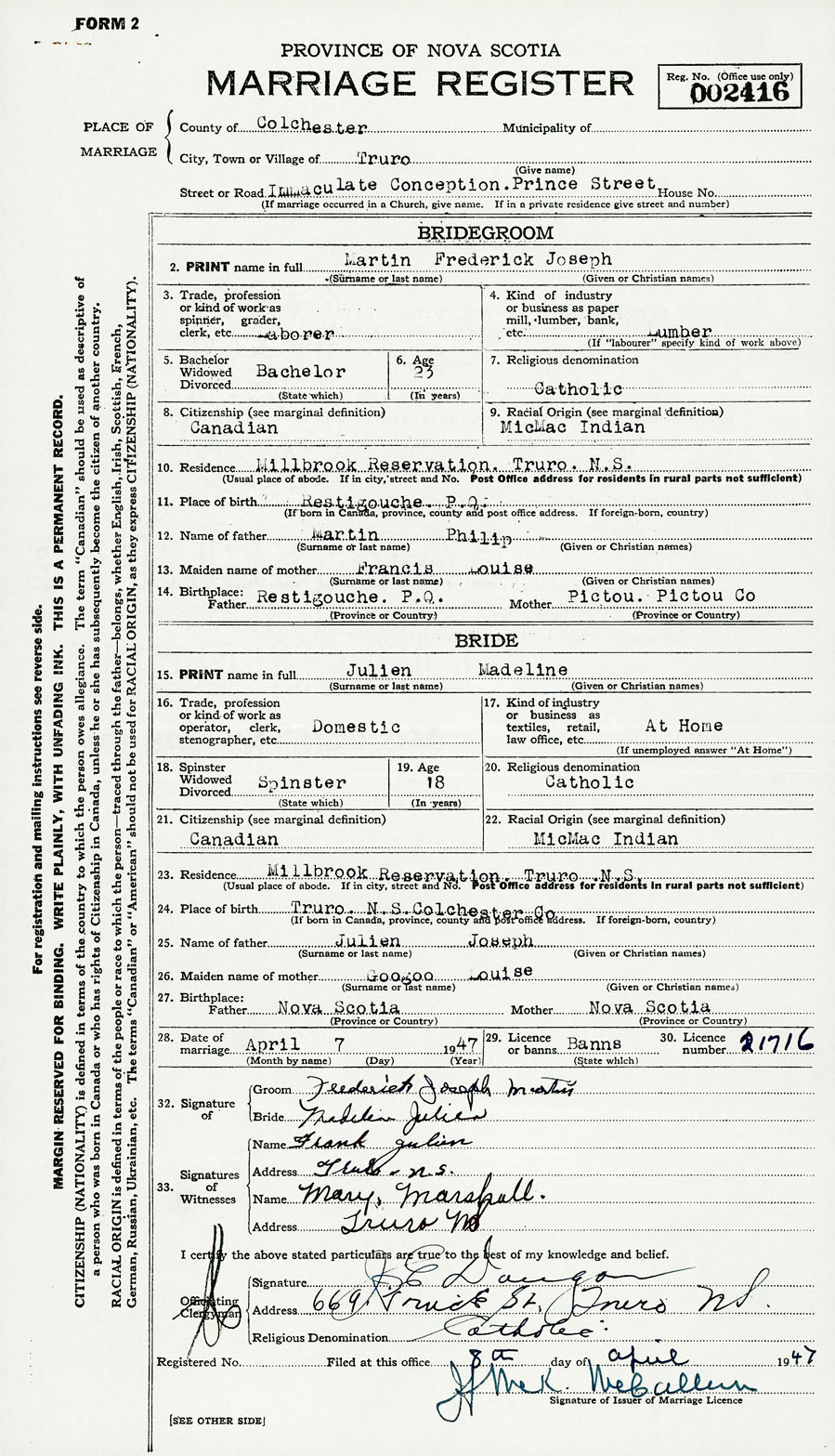 21. Citizenship Canadian 22. Racial origin MicMac Indian