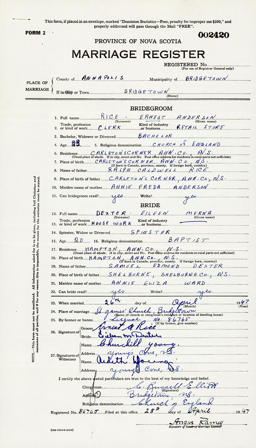 26. Place of marriage St. James Church Bridgetown, Annapolis County