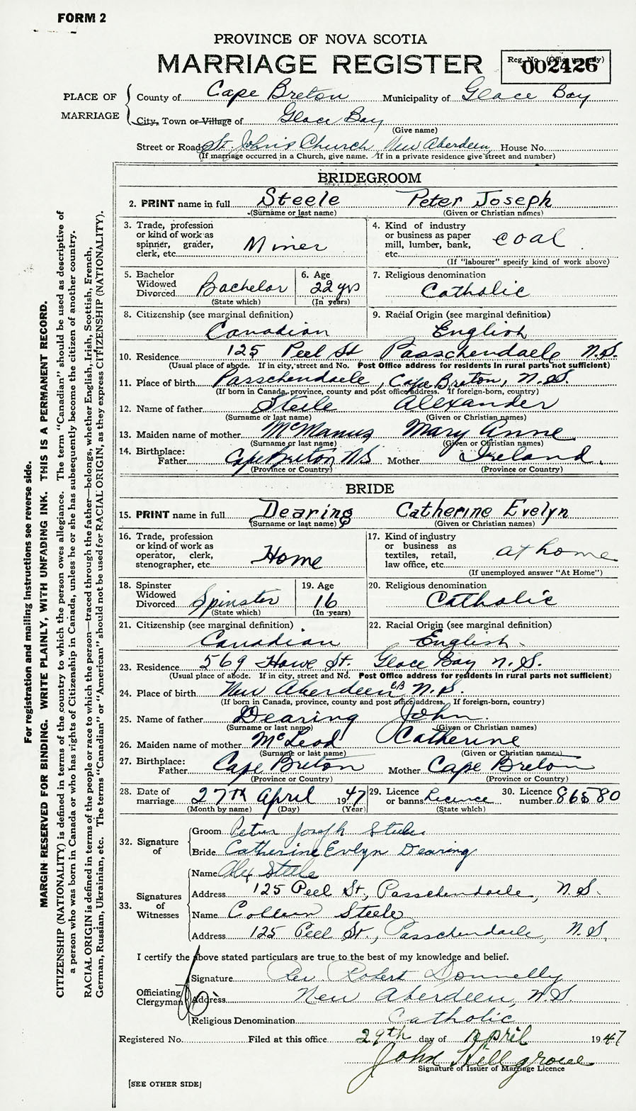 28. Date of marriage April 27 1947 29. By license or banns License 30. License number 86580