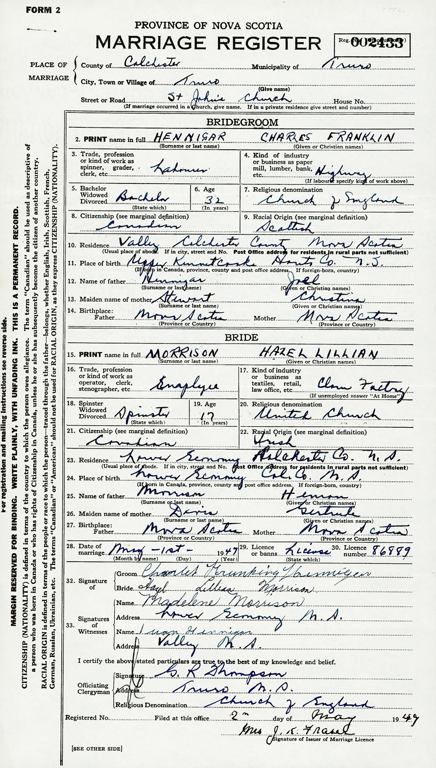 28. Date of marriage May 1 1947 29. By license or banns License 30. License number 86889
