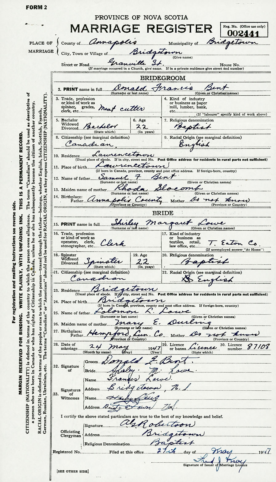 28. Date of marriage May 24 1947 29. By license or banns License 30. License number 87108