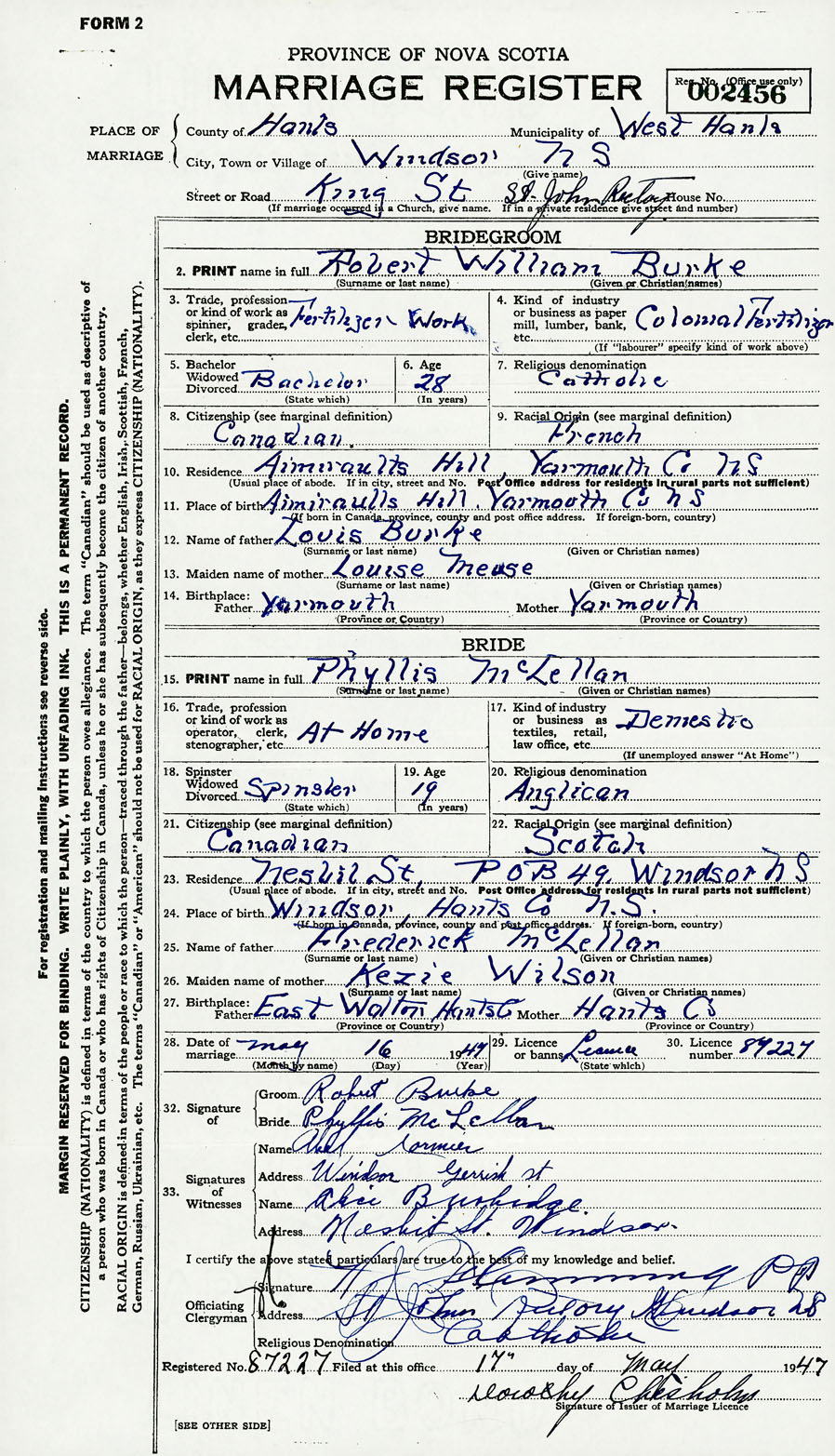 24. Place of birth Windsor, Hants Co, Nova Scotia