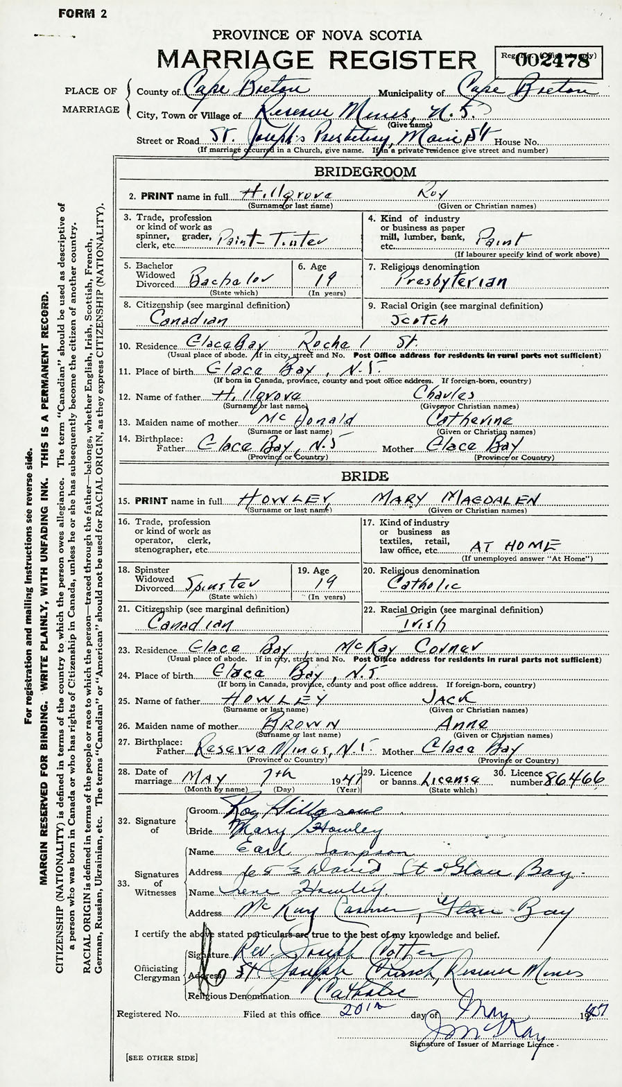 14. Birthplace Father Glace Bay, Nova Scotia Mother Glace Bay