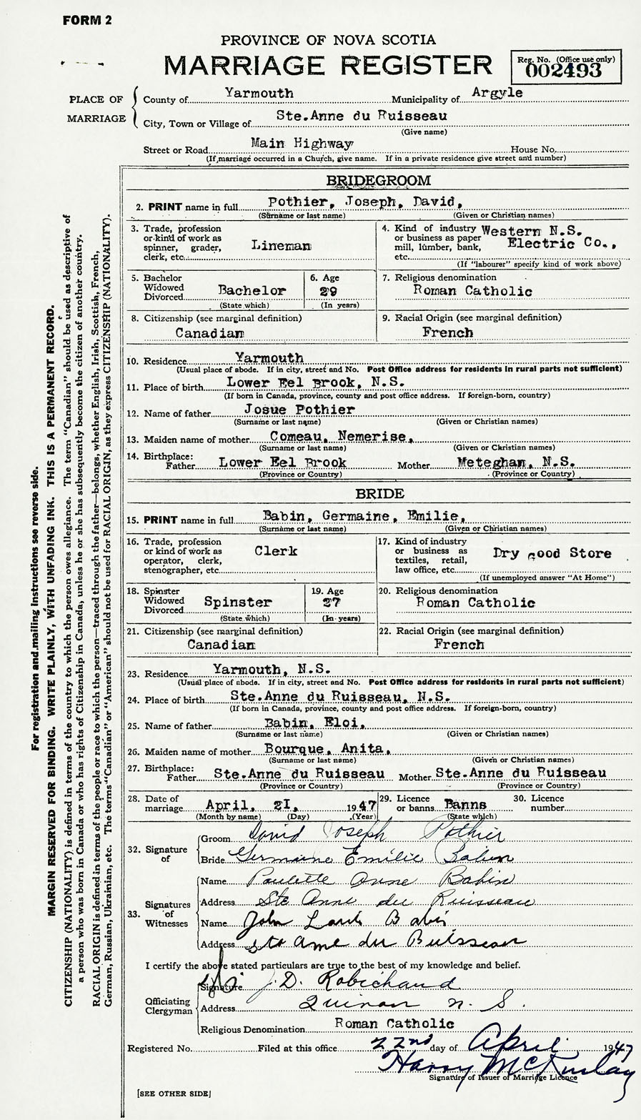14. Birthplace Father Lower Eel Brook Mother Meteghan, Nova Scotia