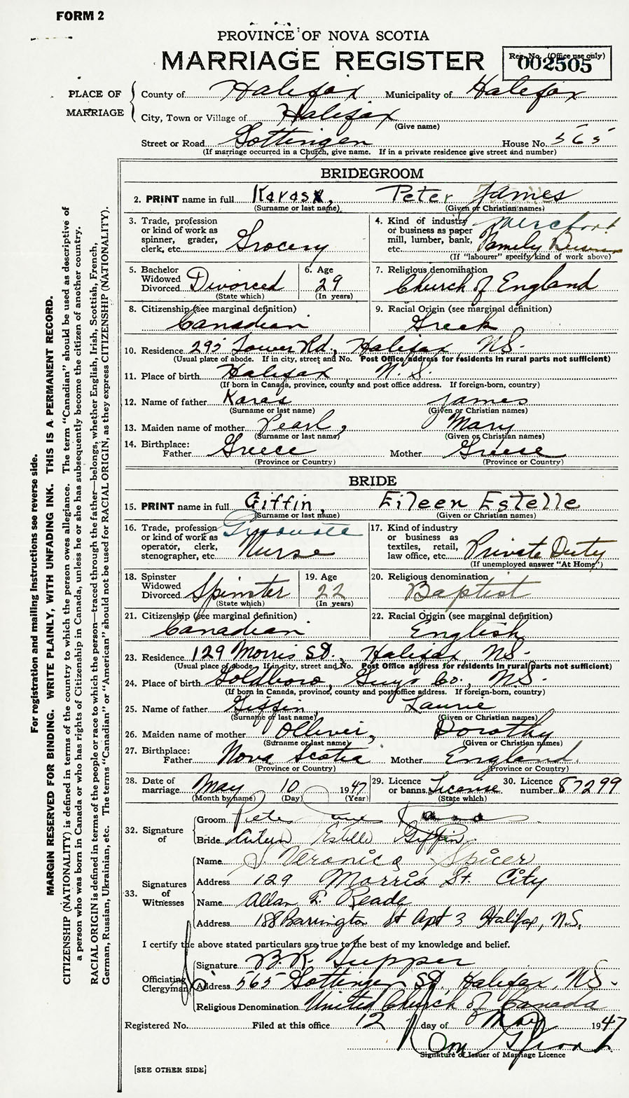28. Date of marriage May 10 1947 29. By license or banns License 30. License number 87299