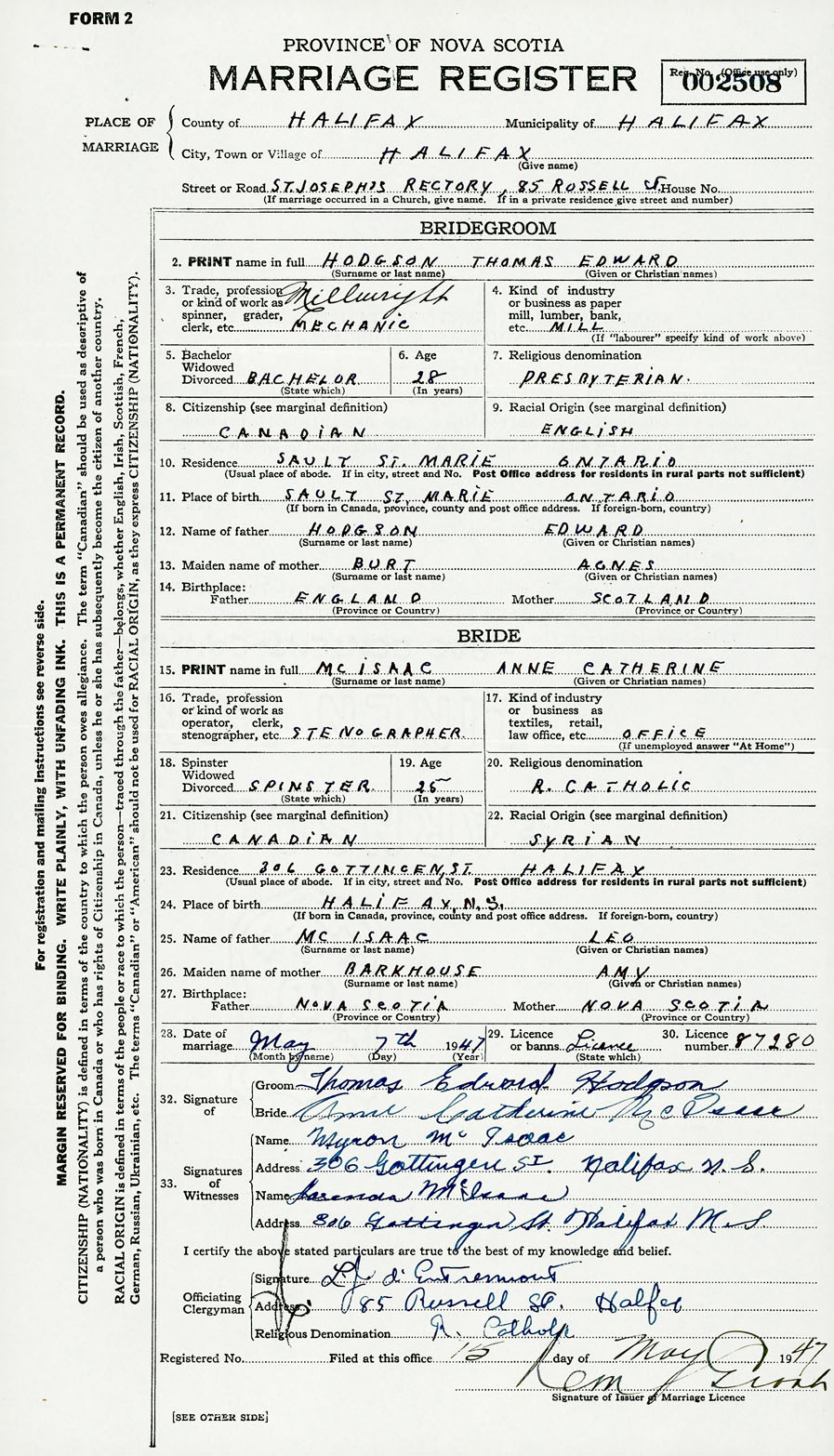 28. Date of marriage May 7 1947 29. By license or banns License 30. License number 87280
