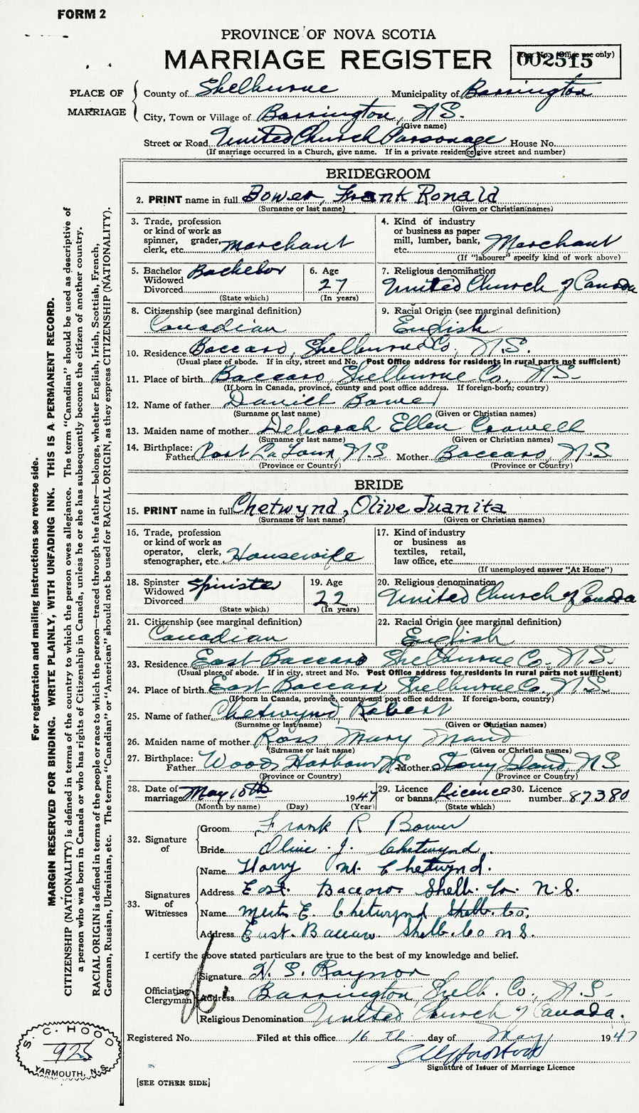 24. Place of birth East Baccaro, Shelburne County, Nova Scotia