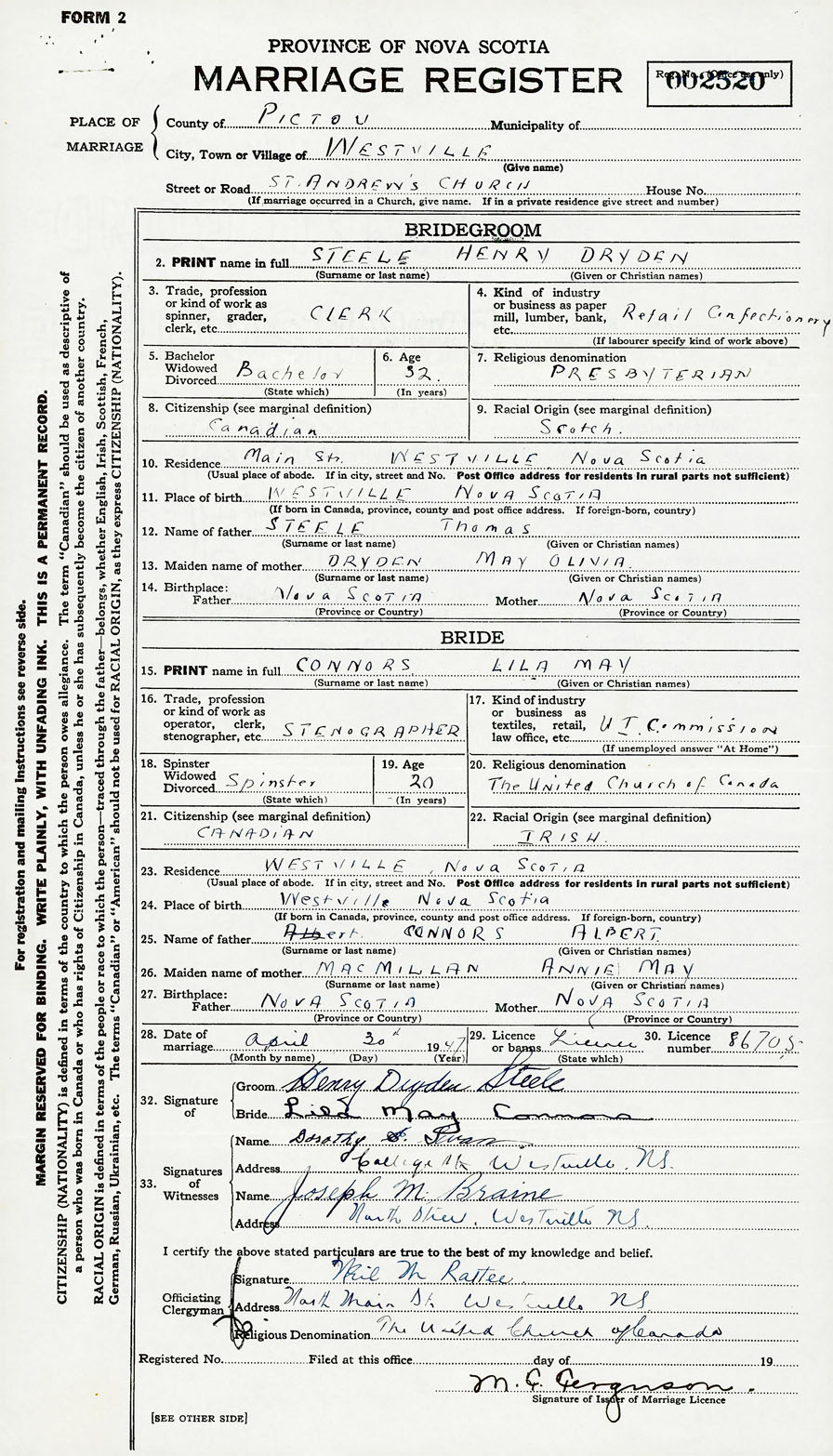 28. Date of marriage April 30 1947 29. By license or banns License 30. License number 86705