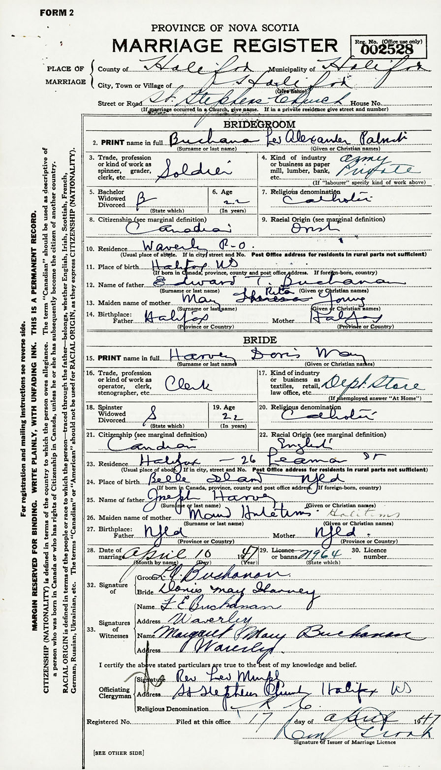 28. Date of marriage April 10 1947 29. By license or banns License 30. License number 21964