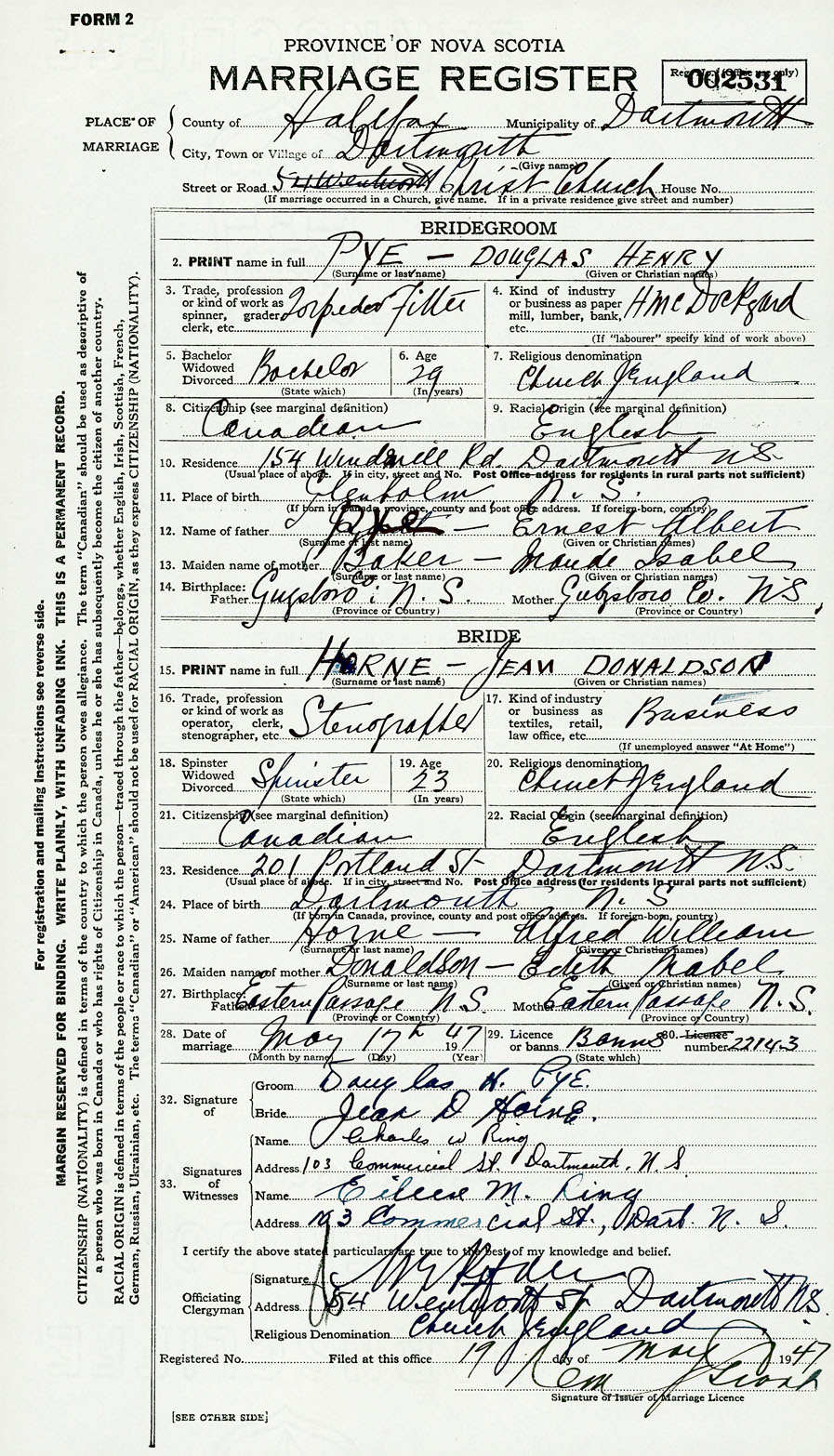28. Date of marriage May 17 1947 29. By license or banns License 30. License number 22143