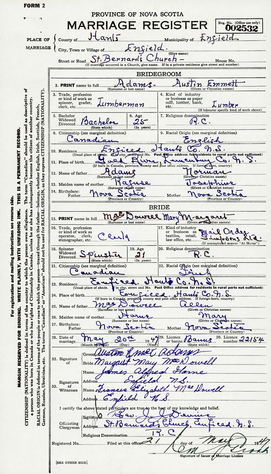 28. Date of marriage May 20 1947 29. By license or banns License 30. License number 22154