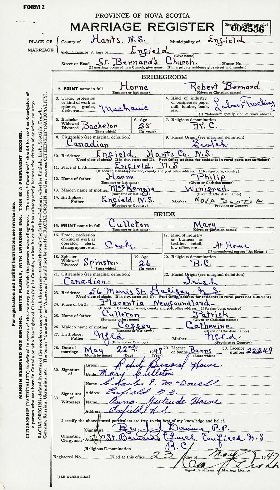 28. Date of marriage May 22 1947 29. By license or banns License 30. License number 22249