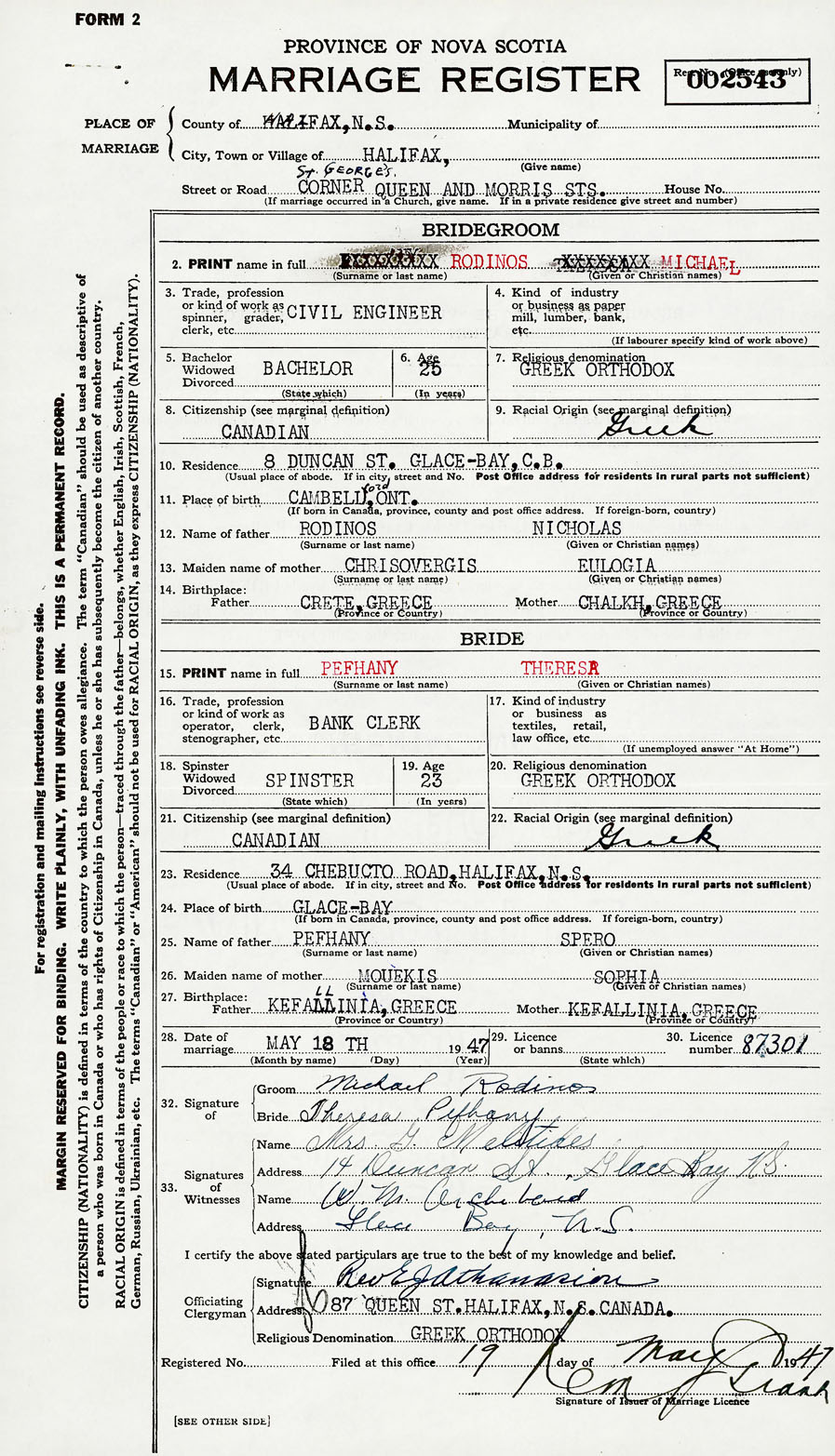 28. Date of marriage May 18 1947 29. By license or banns License 30. License number 87301