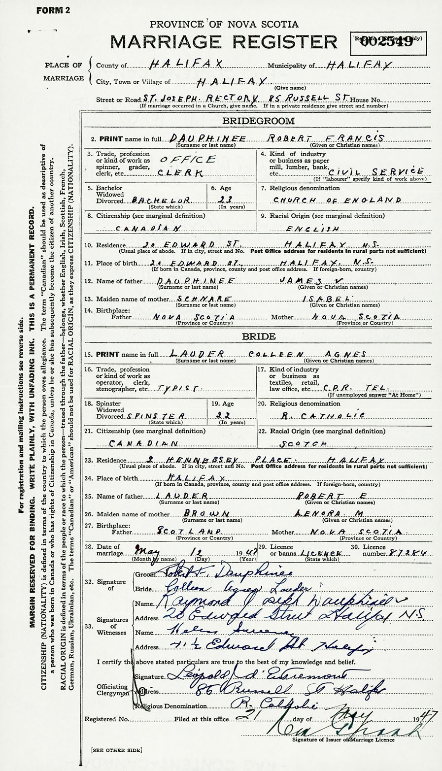 28. Date of marriage May 12 1947 29. By license or banns License 30. License number 87284