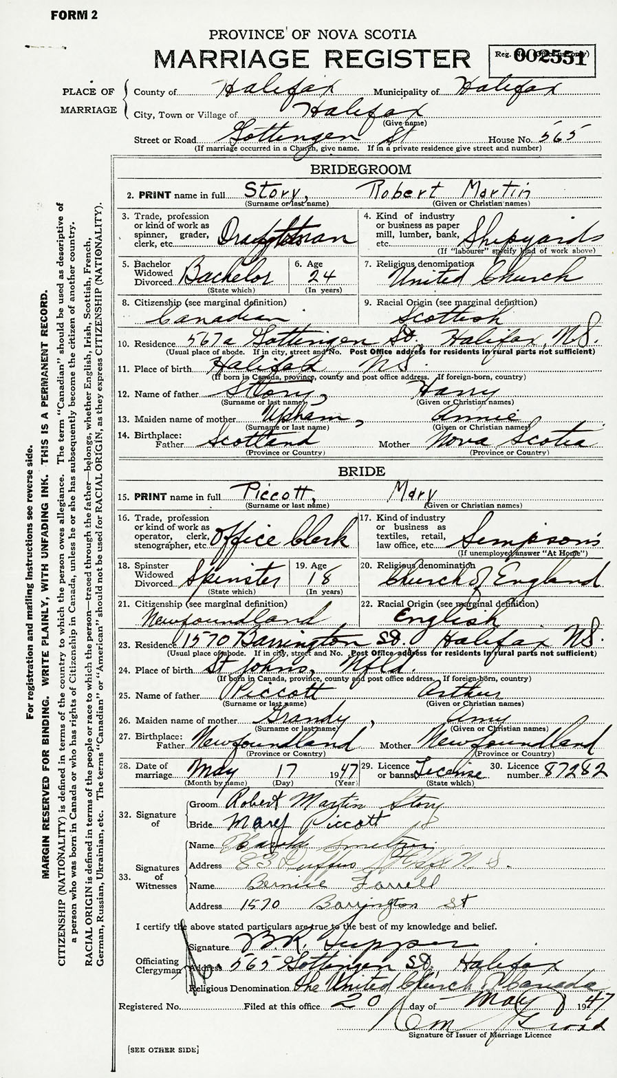 28. Date of marriage May 17 1947 29. By license or banns License 30. License number 87282