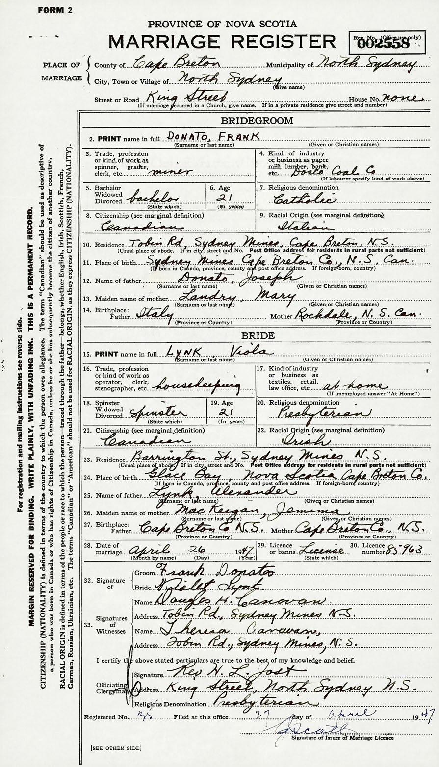 14. Birthplace Father Italy Mother Rockdale, Richmond County, Nova Scotia