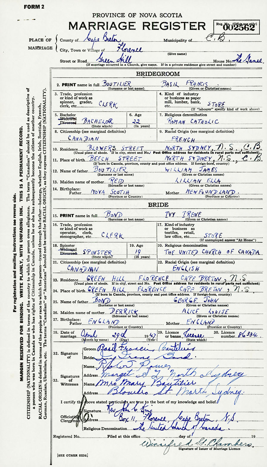 28. Date of marriage April 29 1947 29. By license or banns License 30. License number 86334