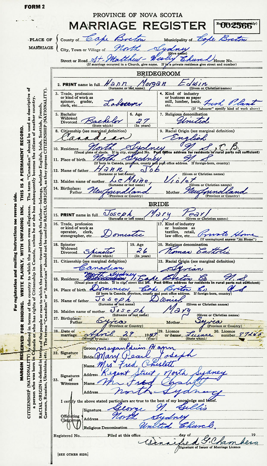 28. Date of marriage April 29 1947 29. By license or banns License 30. License number 87262