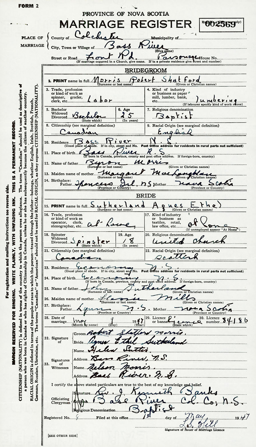 28. Date of marriage May 9 1947 29. By license or banns License 30. License number 84186