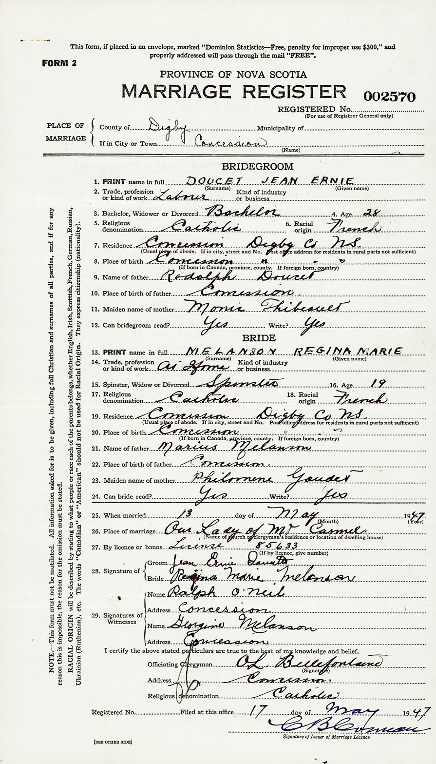 26. Place of marriage Our Lady of Mt. Carmel Concession, Digby County