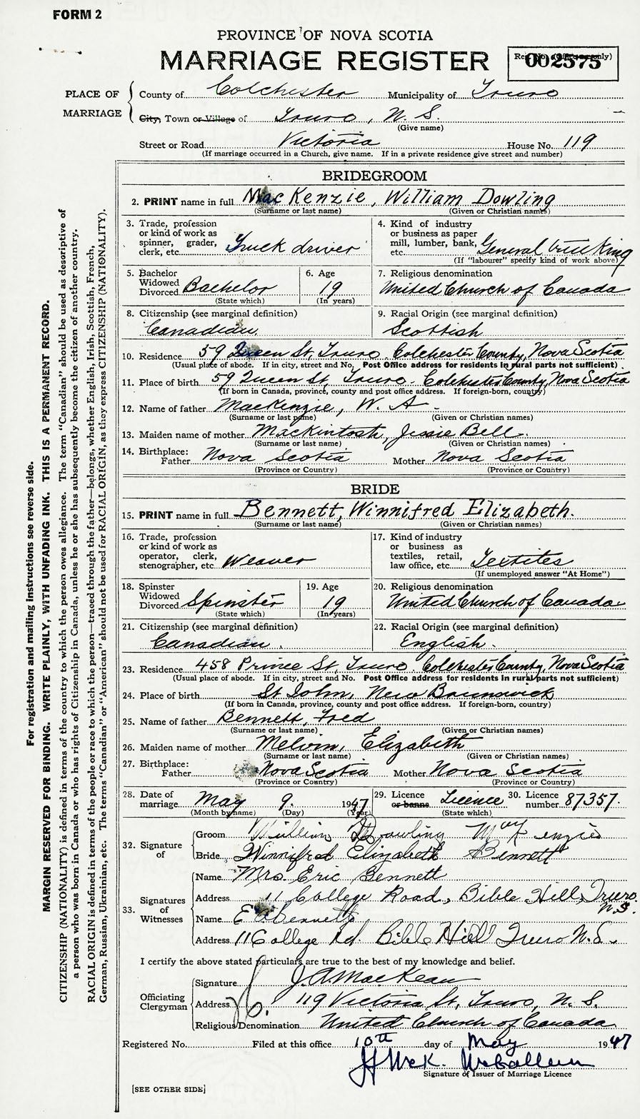 11. Place of birth 59 Queen St, Truro, Col.Co., Nova Scotia