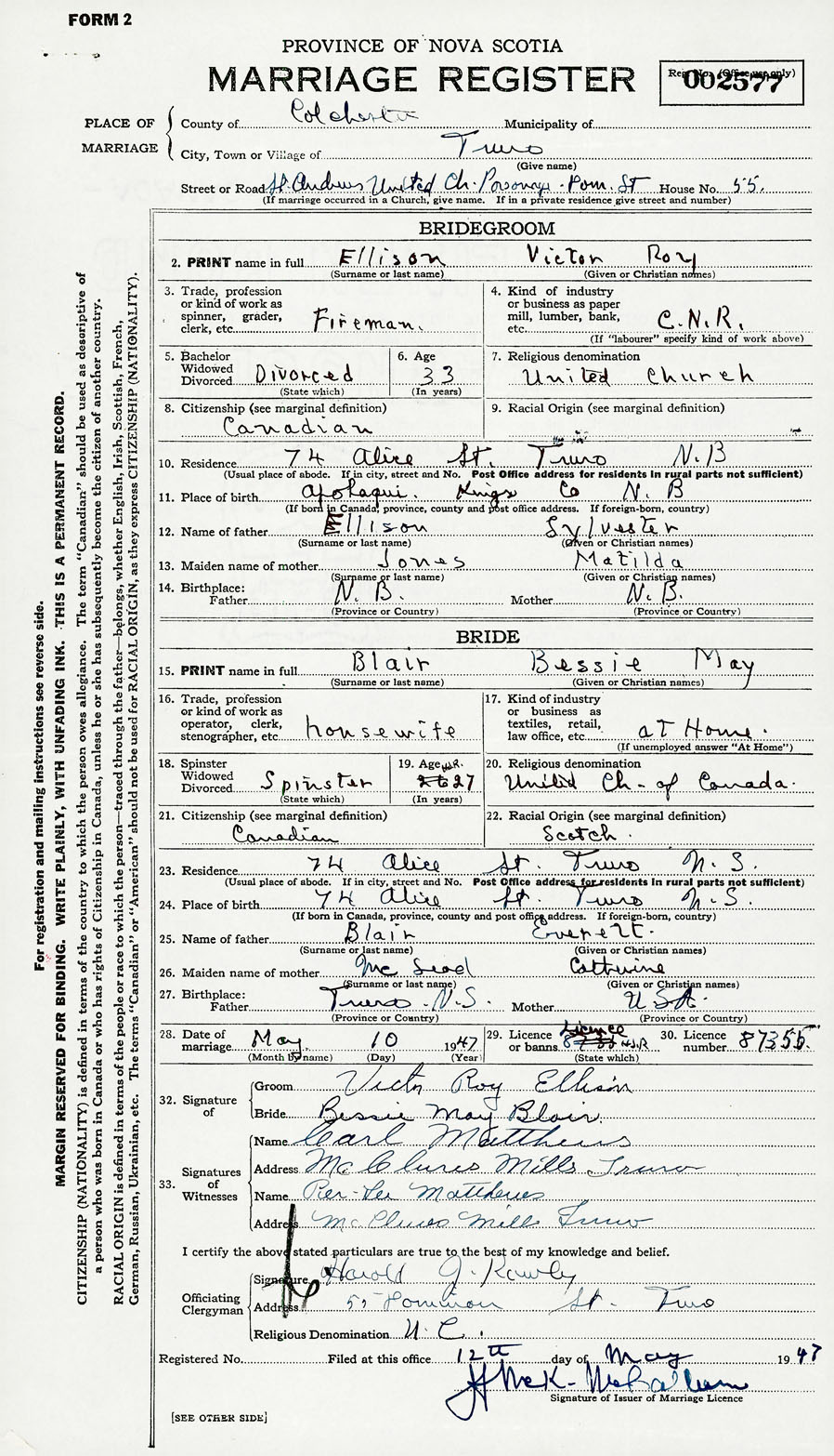 28. Date of marriage May 10 1947 29. By license or banns License 30. License number 87355