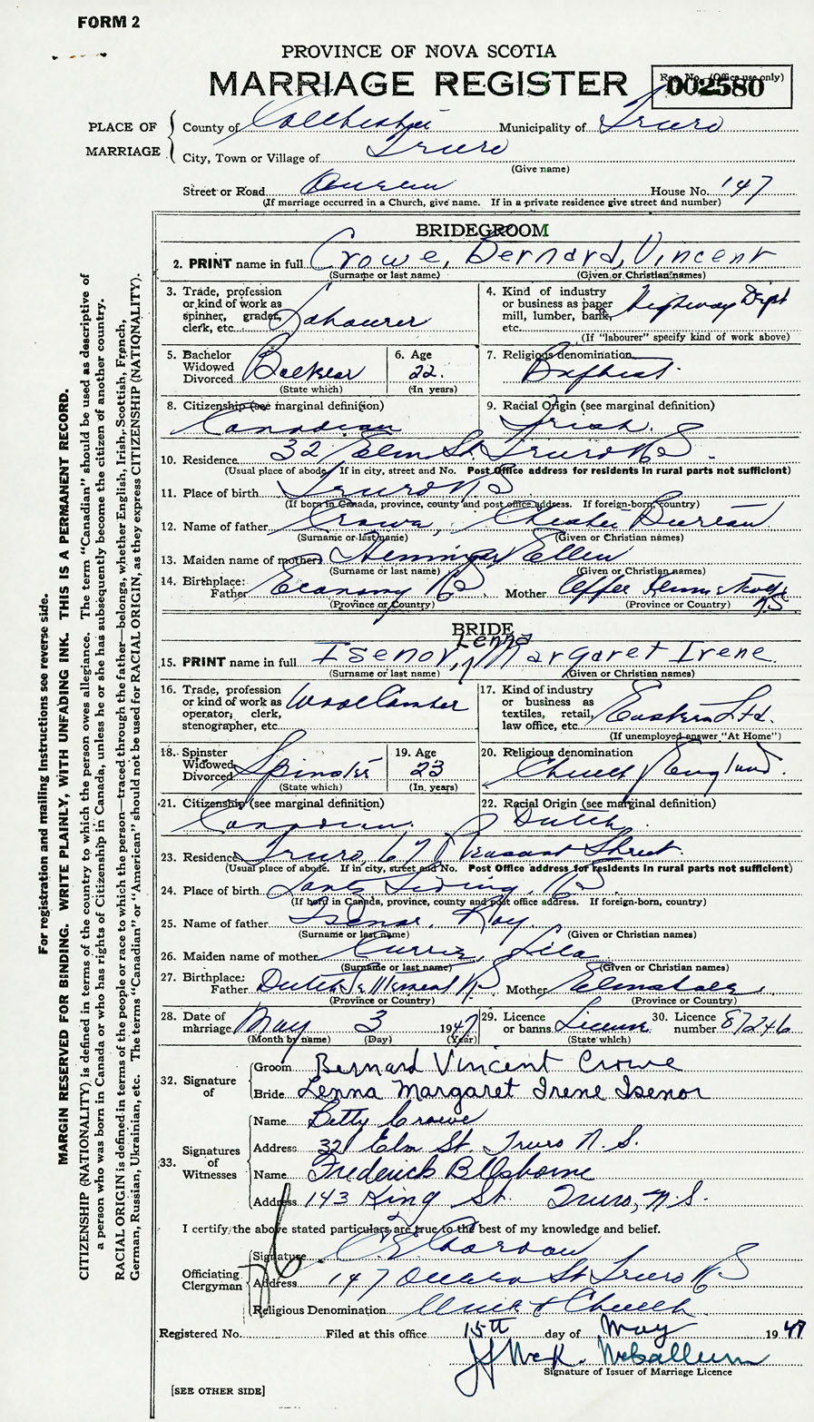 28. Date of marriage May 3 1947 29. By license or banns License 30. License number 87246