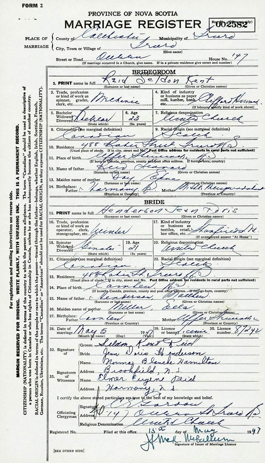 28. Date of marriage May 5 1947 29. By license or banns License 30. License number 87242
