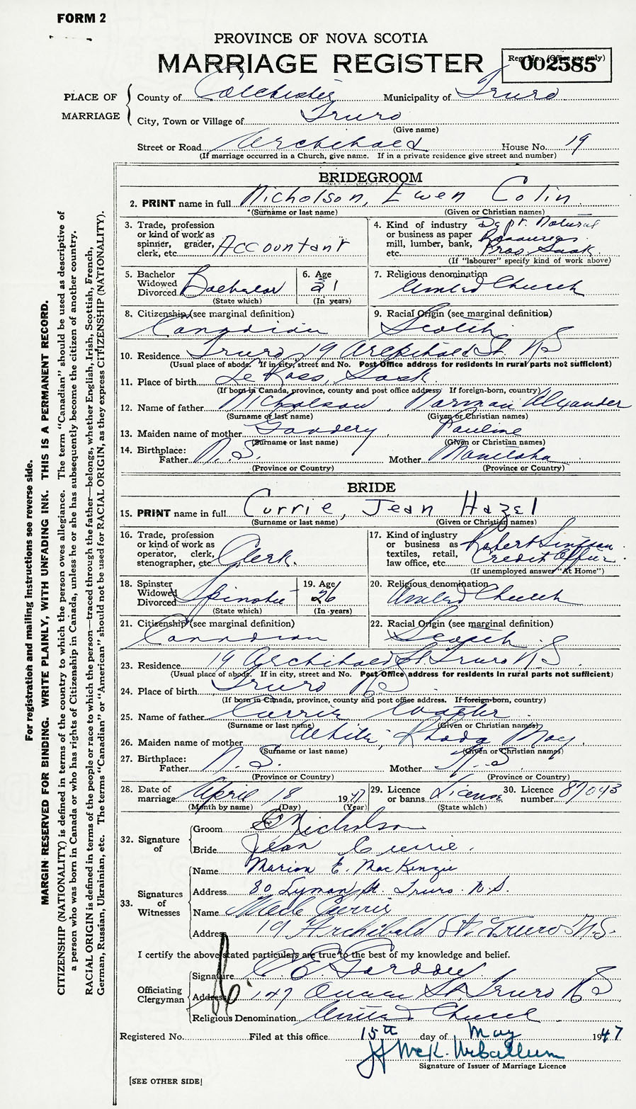 28. Date of marriage April 18 1947 29. By license or banns License 30. License number 87043