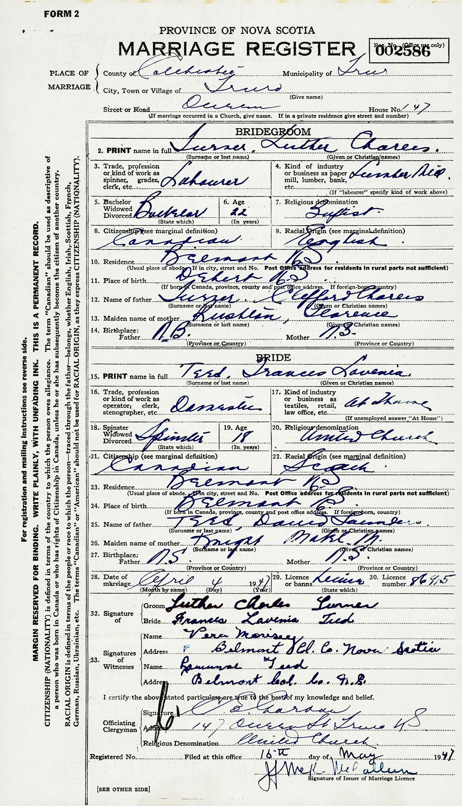 28. Date of marriage April 4 1947 29. By license or banns License 30. License number 86915