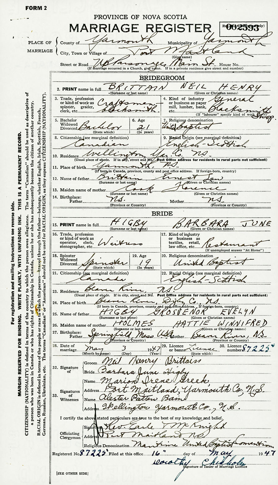28. Date of marriage May 3 1947 29. By license or banns License 30. License number 87225