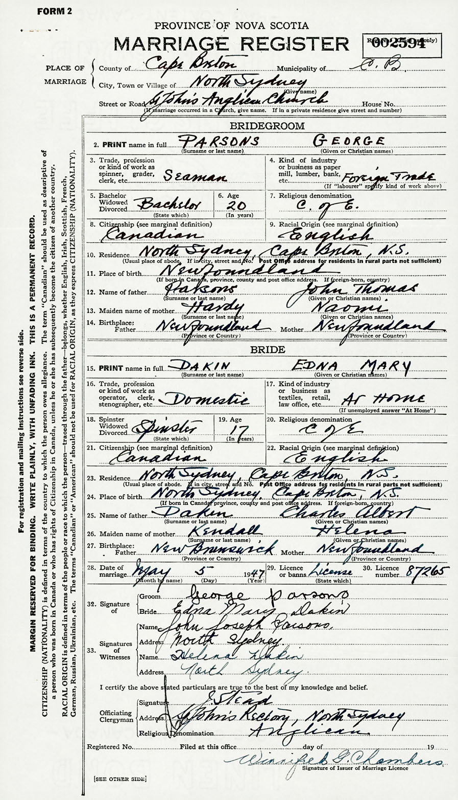 24. Place of birth North Sydney, Cape Breton County, Nova Scotia
