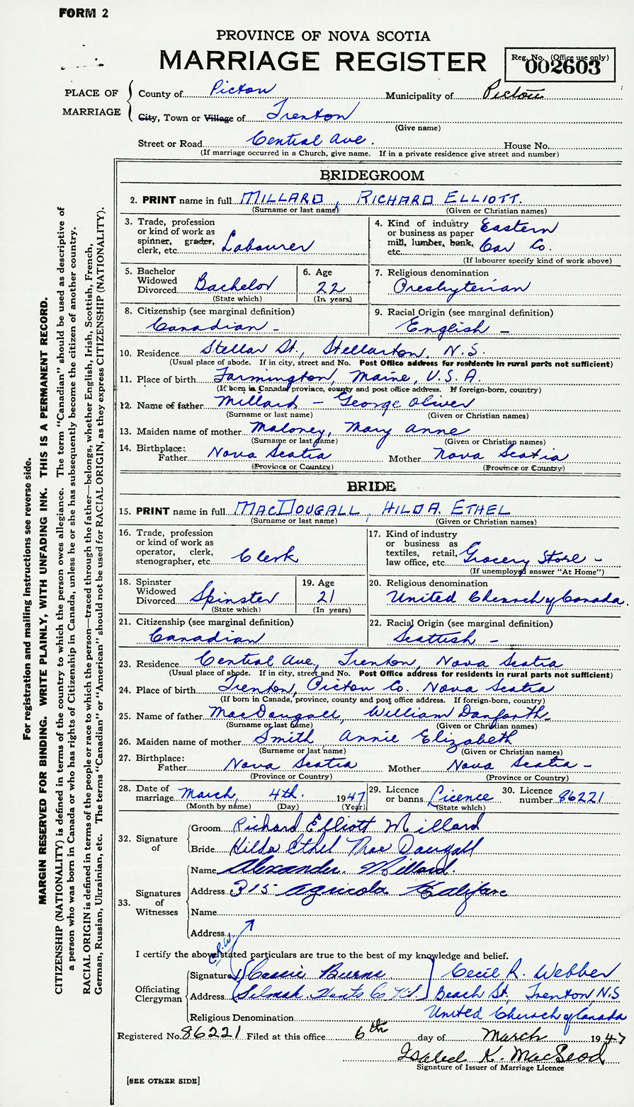 28. Date of marriage March 4 1947 29. By license or banns License 30. License number 86221