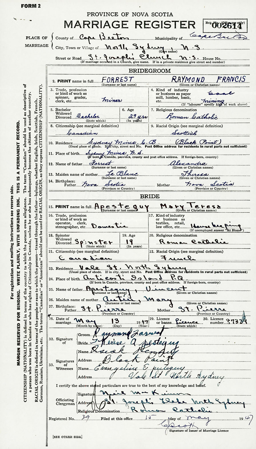 28. Date of marriage May 13 1947 29. By license or banns License 30. License number 87339
