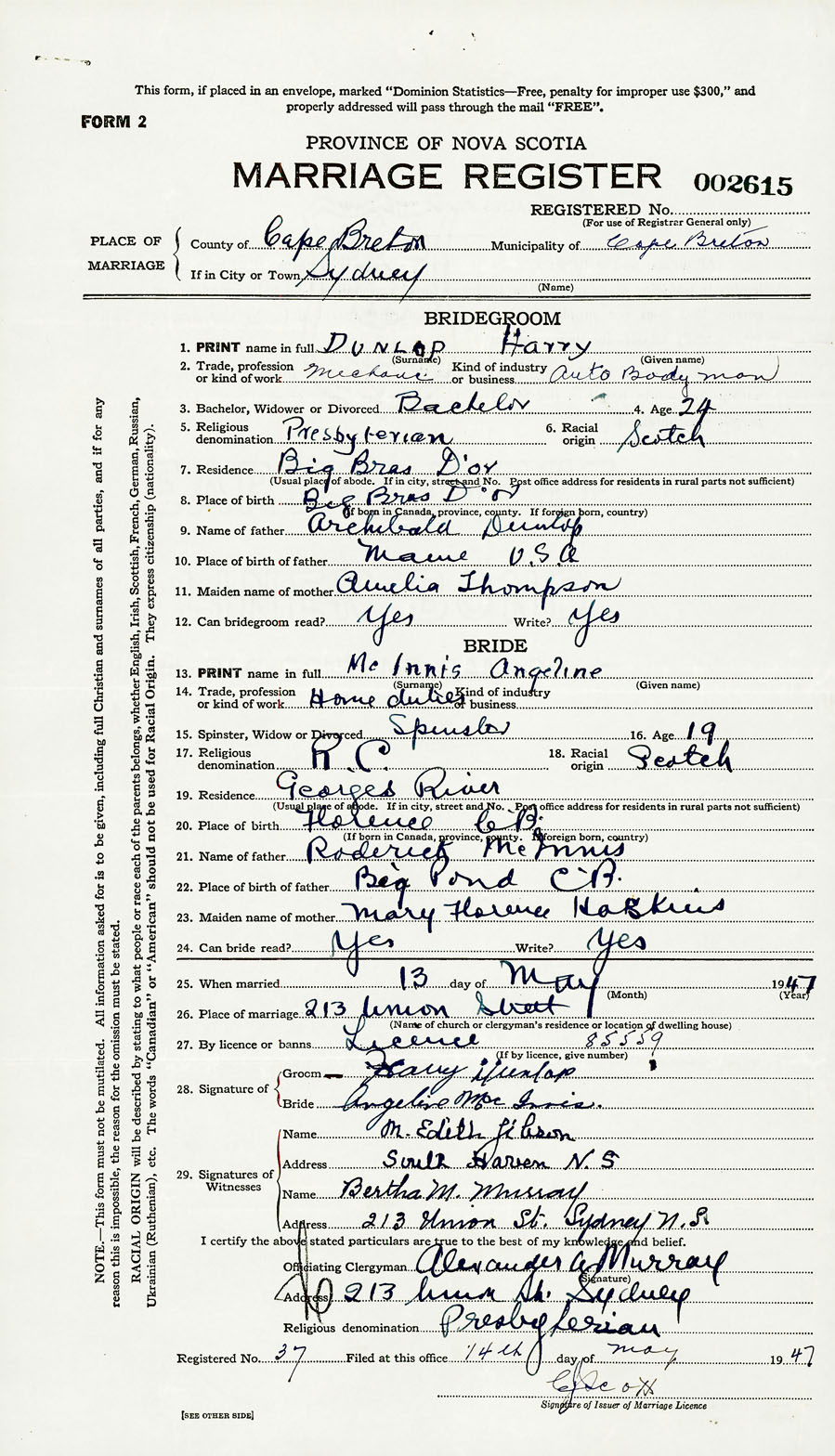 28. Date of marriage May 13 1947 29. By license or banns License 30. License number 85559