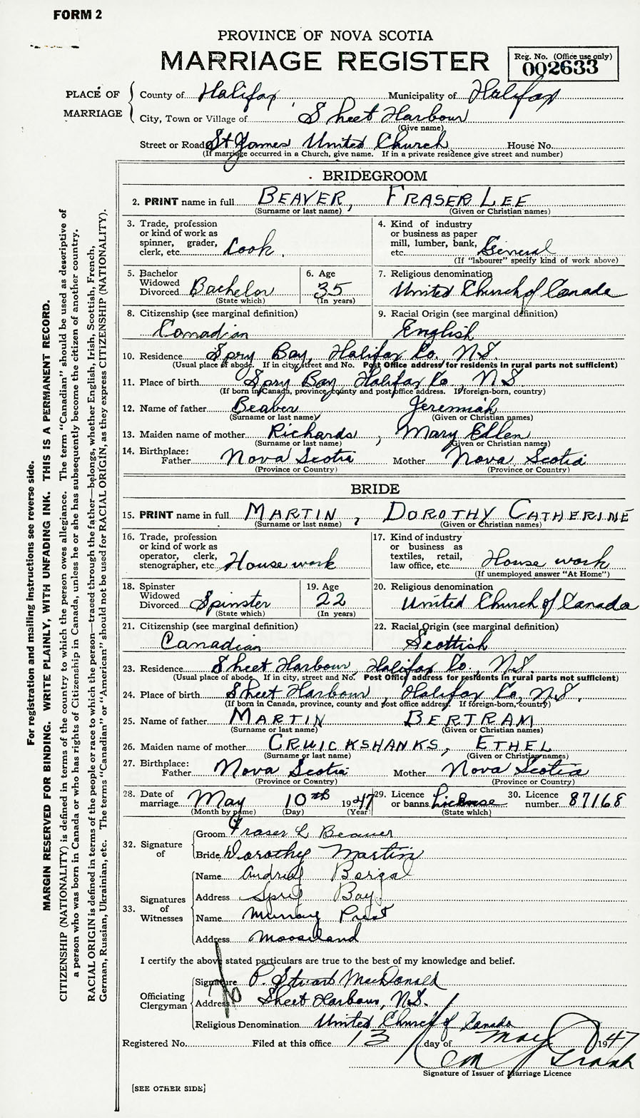 28. Date of marriage May 10 1947 29. By license or banns License 30. License number 87168
