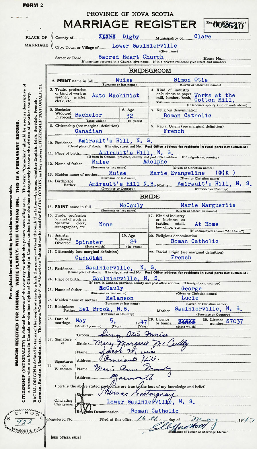 14. Birthplace Father Amirault's Hill, Nova Scotia Mother Amirault's Hill, Nova Scotia