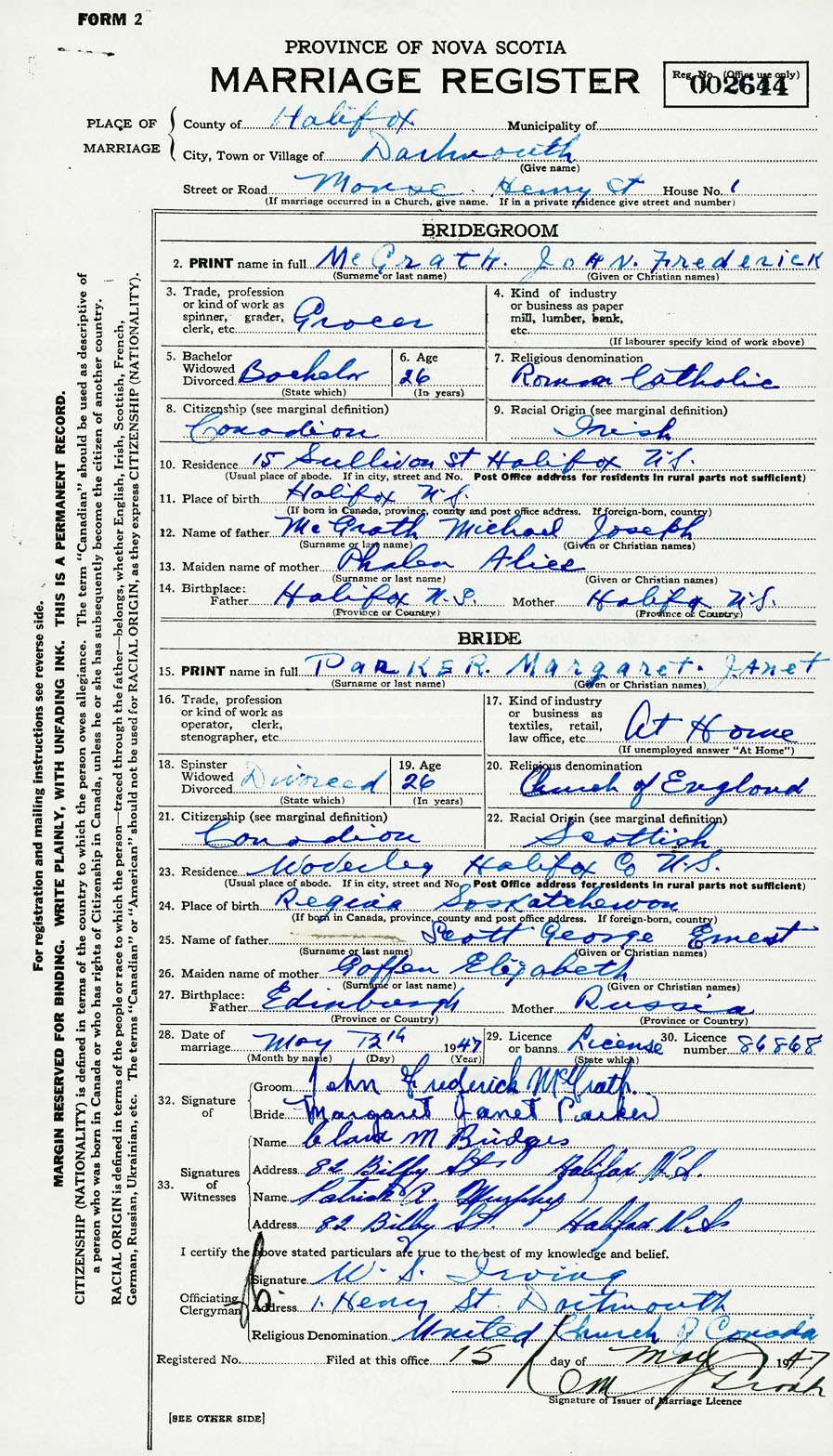 28. Date of marriage May 12 1947 29. By license or banns License 30. License number 86868