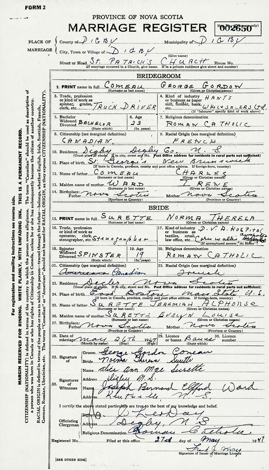 28. Date of marriage May 26 1947 29. By license or banns License 30. License number