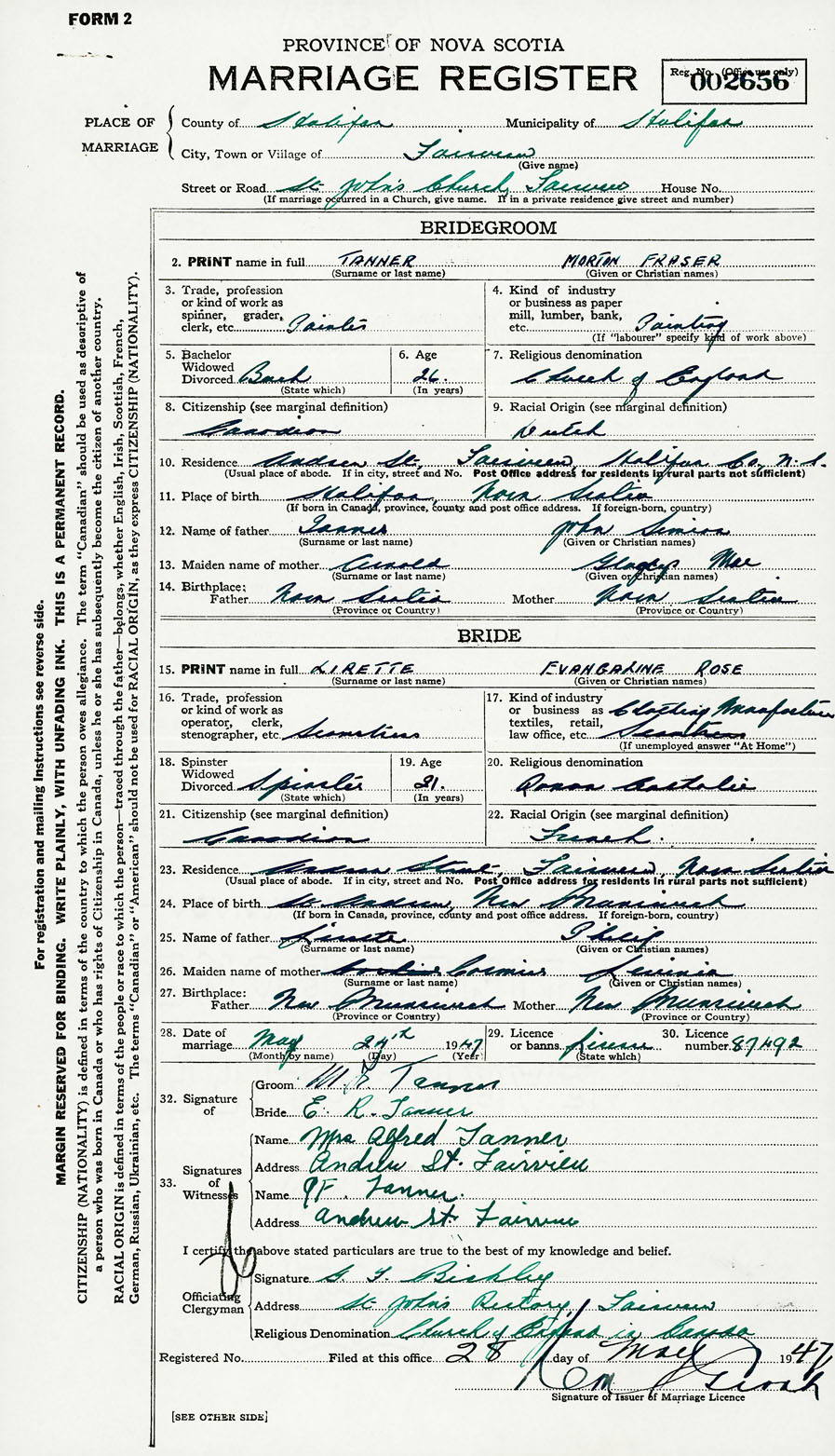 28. Date of marriage May 24 1947 29. By license or banns License 30. License number 87492