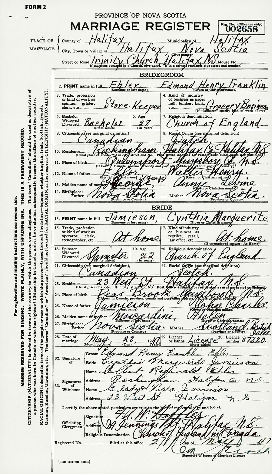28. Date of marriage May 23 1947 29. By license or banns License 30. License number 87320
