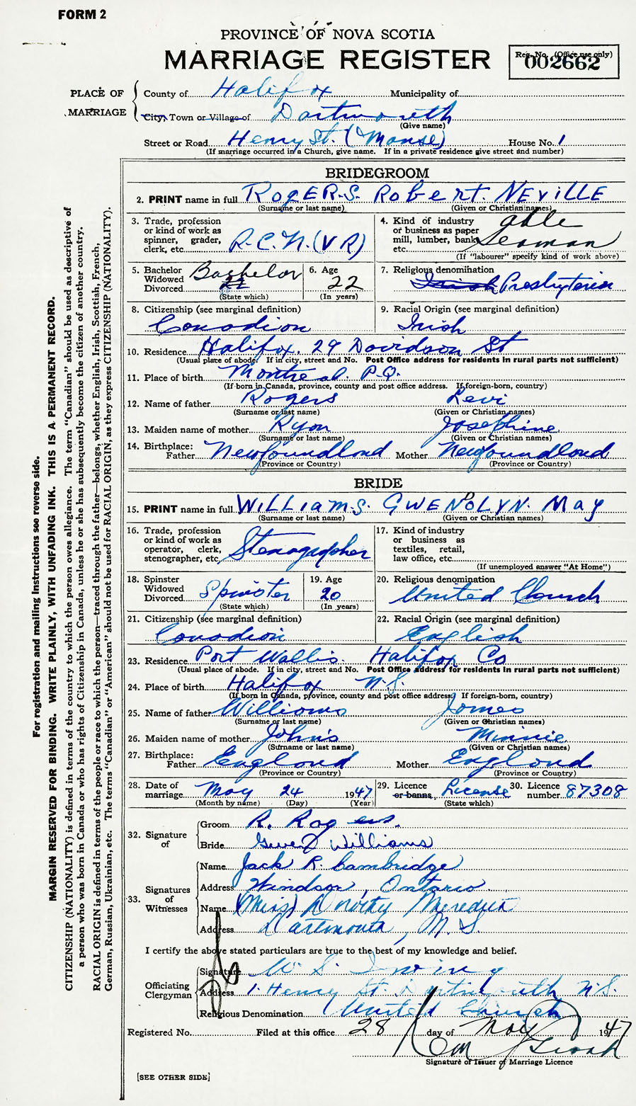 28. Date of marriage May 24 1947 29. By license or banns License 30. License number 87308
